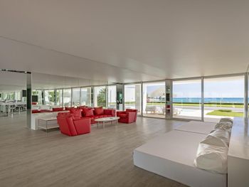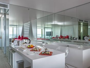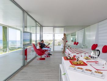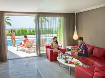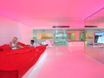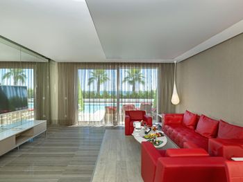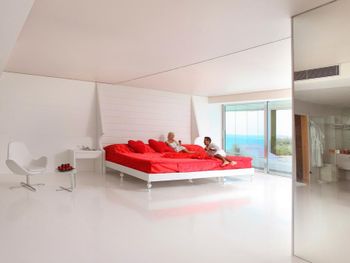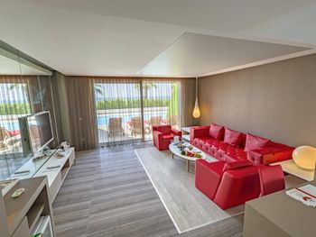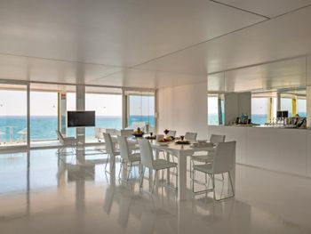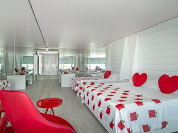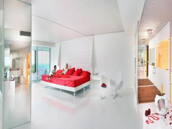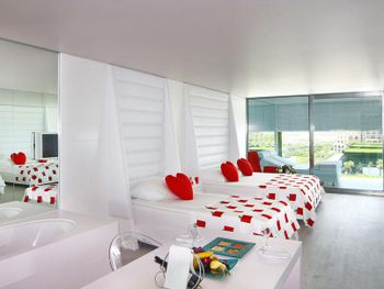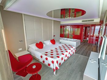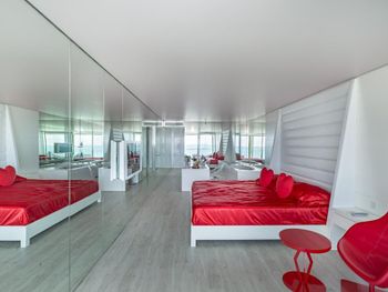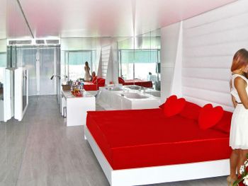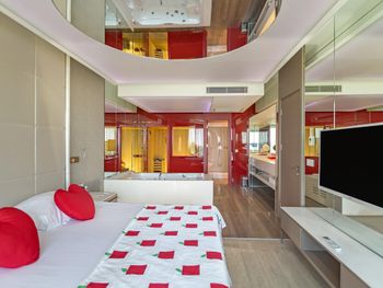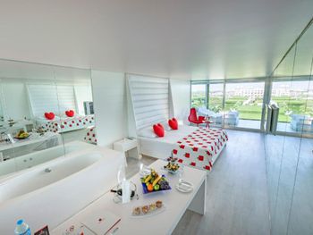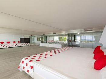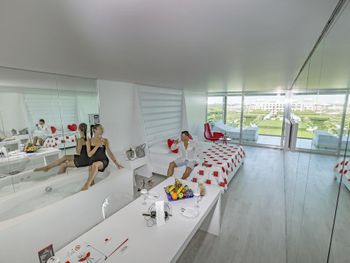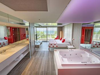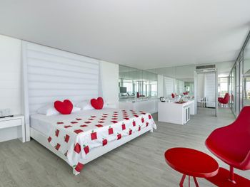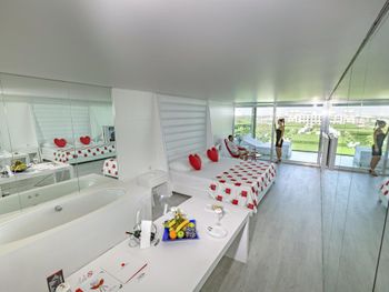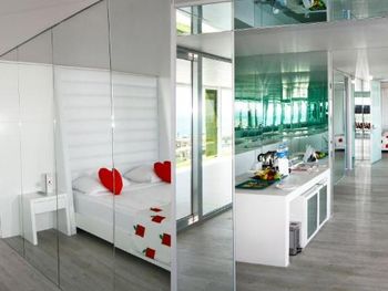В усіх номерах передбачено вікна від підлоги до стелі, дзеркальні панелі на стінах і сучасні білі меблі. У кожному помешканні облаштований балкон, звідки відкривається вид на сад або море. Серед іншого доступний настінний широкоекранний телевізор і ванна кімната з гідромасажною ванною.
