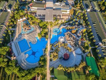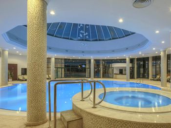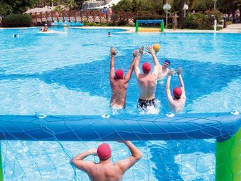 Территория. Несколько открытых бассейнов, один небольшой релакс-бассейн с подогревом под открытым небом, небольшой аквапарк(маленький комплекс для детей и несколько коротких горок для взрослых), закрытый бассейн.