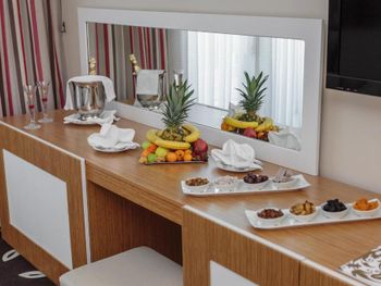 Номер. Номер просторный с выходом на небольшой балкон. Единственное, что было не очень удобно - раковина установлена за пределами ванной комнаты, через небольшую перегородку от кровати. В целом номер хороший, но некоторые моменты требуют ремонта (сбитый и отслоившийся угол шкафа, небольшие пятна плесени на кафеле в ванной, сколы на плинтусах и столах и т.д.). Приятно удивил велком-сюрприз от отеля: на столе нам оставили несколько турецких сладостей, бутылку вина, фрукты, открытку и небольшой букет цветов. Ничего необычного, но было очень приятно.
