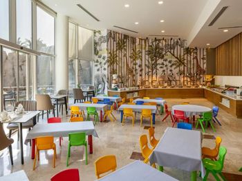 Что очень не понравилось так это поведение некоторых гостей . Совершенно невоспитанные дети дети носились по ресторану сбивая с ног пожилых людей , хватали руками арбузы и дыни потом кидали их обратно . Где были родители этих детей??? Был еще эпизод на пляж 15+ пришла мамаша с орущими детьми и коляской . Я не против мам с детьми , в отеле 400 м береговой линии и 20 метров тихого пляжа где написано на нескольких языках вход старше 15 , зачем их туда пускают ? Мое предложения персоналу быть менее лояльными к людям идущим против правил .