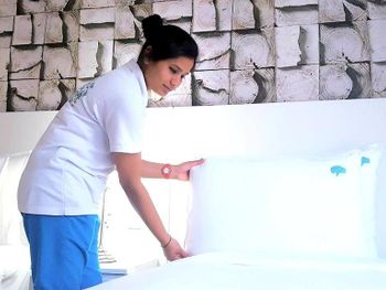 Персонал на наши просьбы реагировал весьма вяло. Один раз пришли убираться в 9 утра, навязчиво так долбили и звонили в дверь. Сказали, что мы спим ещё. Все-таки отдыхать приехали. Уборщица попросила позвонить, когда мы куда-нибудь уйдём. Мы позвонили в 11 и ушли. К 2 часам дня номер не был убран. Потом мы ушли в 3 ещё на 2 часа. К 5 часам опять всё было грязное. После этого мы уехали в магазин и уже к 8, НАКОНЕЦ-ТО, всё убрали.