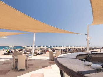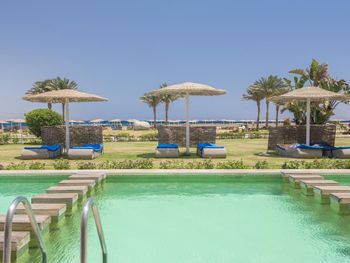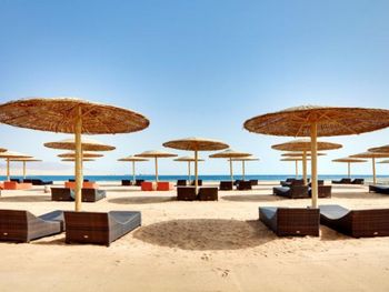 Считаю, что на пляже было бы всем комфортно, если бы персонал следил за тем, чтобы под одним зонтом располагалось 2 лежака и хотя бы 1 загородка от ветра. Иначе народ стаскивает себе нужное и ненужное количество лежаков и загородок. В результате часть людей не может найти себе комфортного места. Это при том, что ценовая категория отеля достаточно высокая.