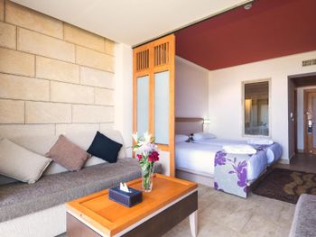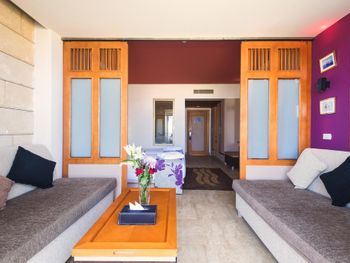 В душе не было горячей воды. Шумный кондиционер. До обеда на море сильные волны, и можно купаться только в небольшом закутке. Еда не очень разнообразная, но съедобная. Завтраки ужасные, особенно блинчики. Зазывалы на пляже очень навязчивые, но можно взять специальный флаг, и они не будут приставать. Лежаки вечно занятые. Понтона нет. Пожилой таксист от отеля грубоватый. В целом отель точно не на 5 звезд.