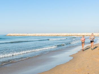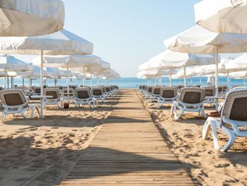 -море в 3 минутах ходьбы, очень близко. собственный прекрасный песчаный пляж с бесплатными зонтиками и лежаками. море прозрачное, очень чистое, вход в воду плавный - идеально для купания детей