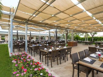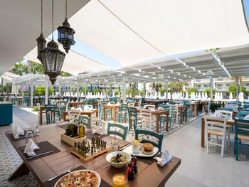 разнообразная хорошая еда в основном ресторане - шведский стол. Удобно самому наливать вино, пиво, кофе, напитки, а не ждать, когда принесет официант. Для детей отдельные столы с едой. Предоставляются детские кресла, коляски.