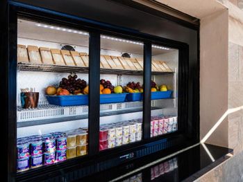 Холодильника не оказалось в номере, как выяснилось его можно получить за отдельную плату. В номере нет посуды, на ресепшене посоветовали обратиться в ресторан. В ресторане отказали, сославшись на табличку, где было написано, что нельзя выносить еду с собой. Но дали одноразовые тарелки, стаканы и приборы.