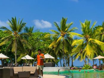 Персонал доброжелательный. Заселили быстро. Вылет был ночью и нам после чек аут бесплатно предоставили простенькую комнату до 23-00 где мы смогли переодеться и принять душ а также отдохнуть перед вылетом. Такое не часто практикуют в отелях. Территория отеля зеленая, народу не много, мест под пальмами предостаточно. Питание в отеле простенькое без изысков. Про оллинклюзив не скажу мы питались в ресторане по меню. Цены приемлимые. Винная карта приличная. бутылка вина стоит примерно20-25$ Пляж широкий длинной километра1,5 . Песок мягкий мелкий. Бассейн приличный с баром. Пиво можно пить сидя в воде у стойки. Тук тук до центра стоит 1дол. туда обратно. Сувениры часто продают возле ресторана вечером ( маски, слоны, статуэтки) . Один рукодельный мужичек сам делает и продает,приличного качества и недорого. Местные предлагают сафари по реке и другие экскурсии. Но мы до этого наездились поэтому ни куда не ездили. В киллометре от отеля в районе отеля Палм есть мертвый риф который отделяет от океана небольшую лагуну где никогда не бывает волн и комфортно купаться с детьми. Там единственное место в округе, где можно понырять и увидеть разных рыбок, не так много как в египте, но достаточно, В былые года там встречал мурен , различной окраски. В этом году не попадались.