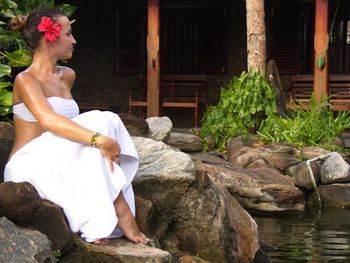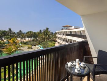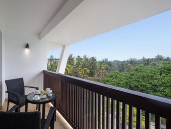 Есть зеленая тенистая территория перед океаном, огороженная от пляжного "базара", по реке прямо от отеля можно прокатиться на лодке за крокодилами, змеями, лангурами, взять в руки крокодилёныша.