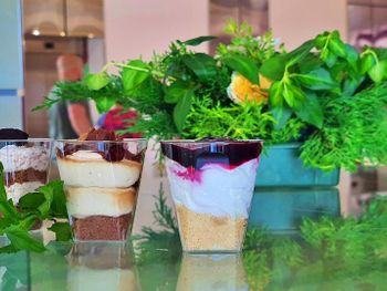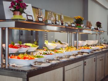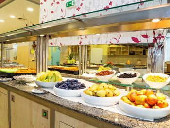 Куча фруктов, овощей, десертов, напитки на любой вкус, алкогольные и без алкогольные.