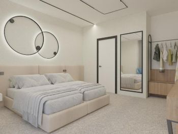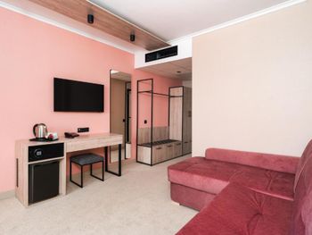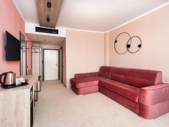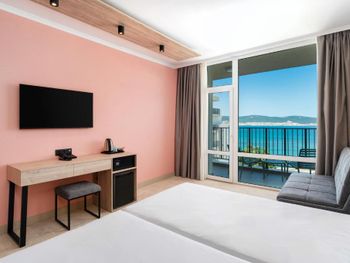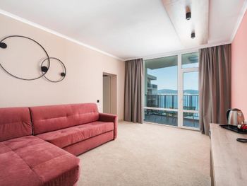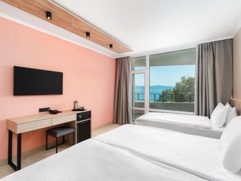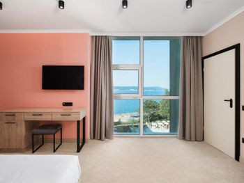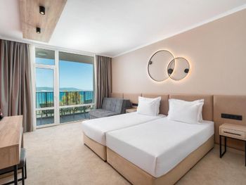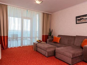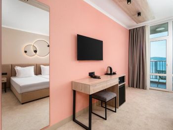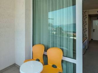 Номера шикарные, просторные, был частичный вид на море, кондиционер работал, всегда была горячая вода, свежий ремонт, хорошая звукоизоляция, есть шкафы, чтобы всю одежду спрятать, кровать огромная и удобный матрас, есть холодильник, чайник, чашки. Просторный балкон и есть 2 кресла и стол.