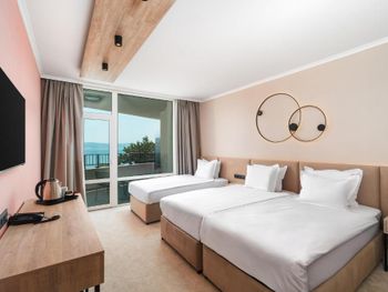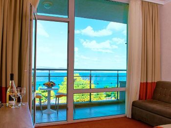 На заметку туристам, которые приезжают под закрытие сезона в номера с видом на море, нужно учесть, что отель стоит фронтально к морю и открыт ветру. Я уверена, что летом это огромный плюс. Сейчас (15-19 сентября 2020) было немного прохладно, т.к. солнце поворачивается за здание после 12ти и остальную часть дня балконы в тени.