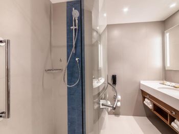 Очень большая дверь в туалете. Неудобно заходить, потому что нужно зайти в душевую кабину, чтобы закрыть дверь.