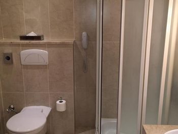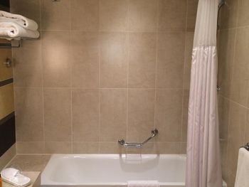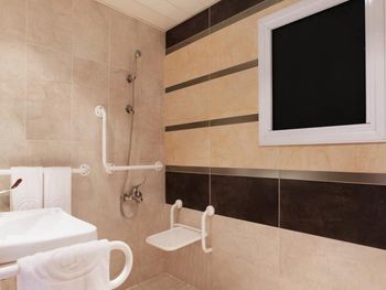 В ванной не хватает крючков для вещей и полочки для шампуней и мыла .