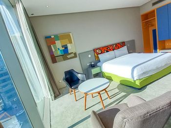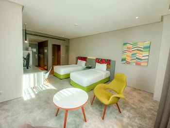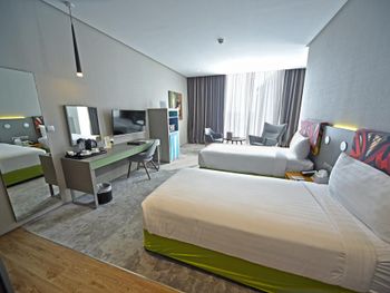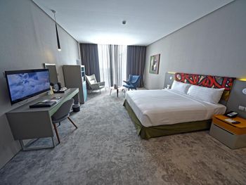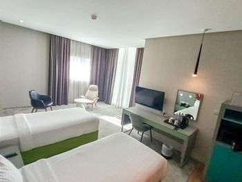 Большой хороший номер с большим панорамным окном с видом на центр. Удобная ванная, мнго места. Персонал очень дружелюбный, часть коллег приехали на много раньше времени заселения, их заселили по первой возможности. Довольно однообразные завтраки, но всего хватало и можно было выбрать.
