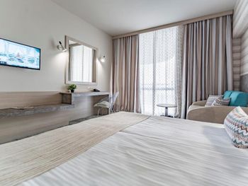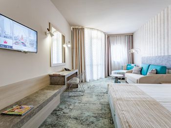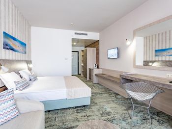В честь дня рождения мужа нам повысили категорию номера и дали номер больше с красивым видом на море и бассейн. В номере было чисто и есть практически все необходимое. Есть теплый, крытый бассейн, где можно поплавать в не сезон. Еда в принципе была вкусной. Отдельное спасибо детской анимации, ребенок остался довольным и не хотел уходить.