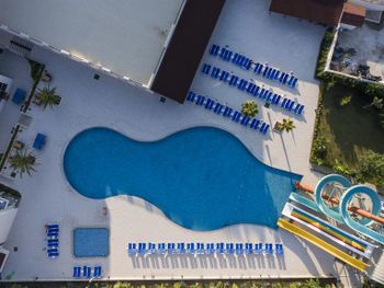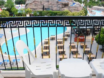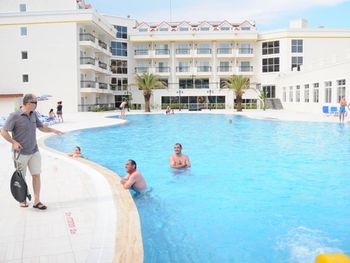 Удобно идти до пляжа и центра города (через красивый парк вдоль русла реки). В отеле есть мини аквапарк из пары горок и куча шезлонгов.