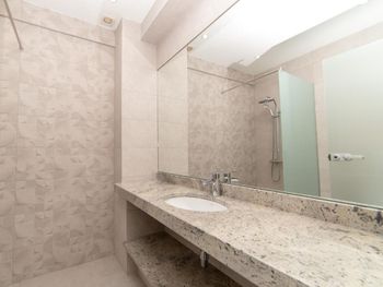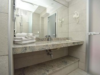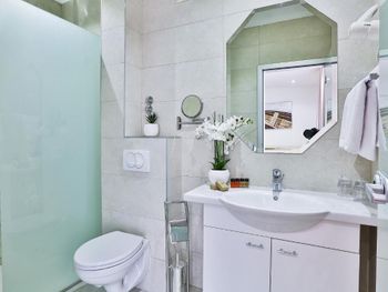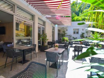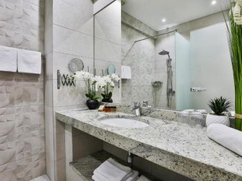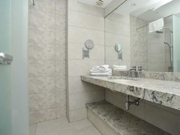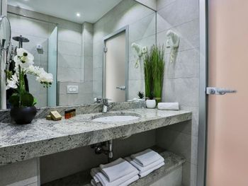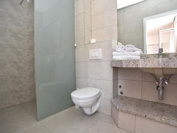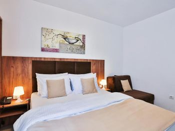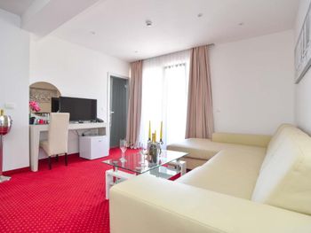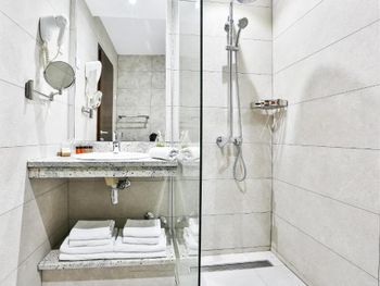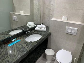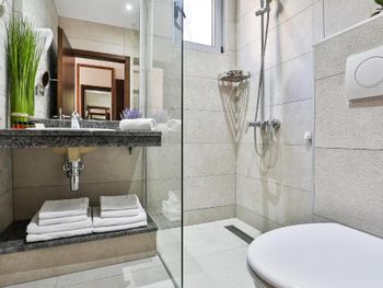 Ванная безвкусная, дешевая сантехника, мало места в номерах. Воды в холодильнике не было. На ресепшене бутылка воды стоит 3€. Я заплатила за 1 ночь в номере 144€ + по приезду с меня взяли 3€ городского сбора и 10€ за парковку. Парковка была переполнена, место там очень мало, для Renault Captur очень тесно. Один из посетителей отеля поставил свою машину поперек других и запарковаться было нереально. В итоге мы сказали что мы оставим свою машину просто на въезде ( при этом выезд из гаража у других посетителей есть, мы никому не перегораживали дорогу. Но с нас за это всё равно взяли 10€!!! За что? Если мы не оставляли свою машину в «приватном гараже». Тем не менее, вышло за 1 ночь 160€. Это того не стоит. Не рекомендую