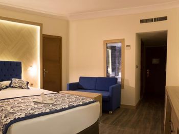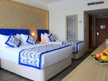 При бронировании было заялен минибар, которого вообще не было. Не было шампуни, мыла, ополаскивателя для волос. Было только жидкое мыло. Отель не соответствует 5 звездам. Тянет на тройку. На балкон дверь не закрывалась. Место для третьего чедовека кушетка, а не кровать. Еда однообразная. Фруктов было мало. Не было ни клубники, ни персиков, ни арбузов, ни дынь. Хотя на рынке все уже продавалось.