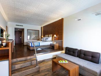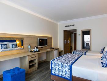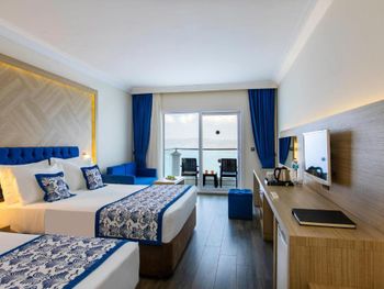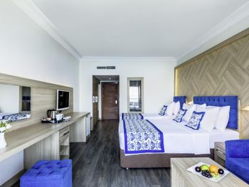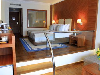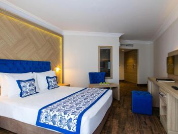 Соотношение цены и качества нас устроило. Мы были в начале сентября, погода была хорошая. Территория отеля огромная, 2 паркинга, аквапарк, территория с бунгало и большой корпус с номерами. Мы были на мотоцикле, паркинг бесплатный. Как мы поняли все номера с видом на море. Номер большой, есть гостинная зона с диваном, есть балкон. Единственное, что расстроило это уборка, а вернее её отсутствие. Уборка заключалась, что полотенце для ног поднимали с пола и вешали на ванну, хотя пол не мыли. Один раз увидели уборщицу, она выходила из номера , вроде убралась, мы её вернули и показали грязный пол и мелкий мусор на полу. Отель находится на нескольких ярусах, к морю идти по лестнице или можно доехать на паровозике, на пляже есть бар, где днём можно перекусить, чтобы не подниматься в центральный ресторан. В ресторане очень большой выбор еды, за каждым приёмом пищи дают мороженое. Питание первые 2-3 дня было более скромное, потом каждый обед и ужин было несколько видов мяса и рыба была каждый день, очень много закусок. Свободные лежаки у бассейна после 10 сложно найти. Анимация хорошая. В общем нам отдых понравился.