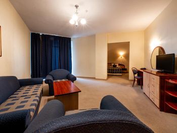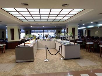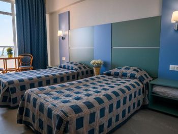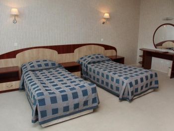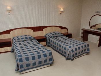 В номере ковролин поэтому запачканные места бросаются в глаза лучше плитка. При полупансионе нельзя брать воду какие нибудь жидкости на ужин, непонятно чем запивать еду . Стоит охраница блондинка и всех отгоняет. Были в отелях три звезды там можно было пить соки чай. В ресторане маленький шведский стол, при таком огромном количестве отдыхающих,поэтому на завтрак ужин стоят люди с тарелками в очереди 45 50 человек