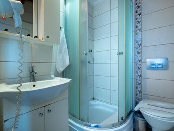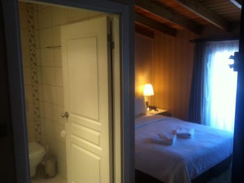 Сантехника в плохом состоянии, каждый раз после приёма душа приходилось убирать воду с пола, старая мебель (на фото этого не видно), большая слышимость (но спасает маленькое количество номеров и проживающих в них), есть ещё одна терраса с прекрасным видом ,но она не приведена в порядок.