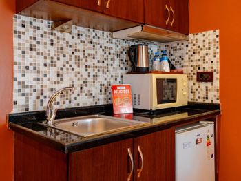 Есть микроволновка, холодильник и маленький электрический чайник, но нет никакой посуды, кроме нескольких бумажных стаканчиков и палочек-мешалок - ни ложек-вилок, ни ножа, ни тарелок... В микроволновке даже не было круглого стекляного поддона.