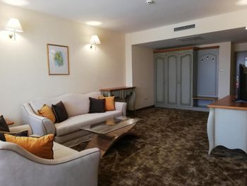 в номерах неудобная мебель, несоответствующее 5* ванной комнаты. отсутствие общественного транспорта до ближайших населенных пунктов, предоставление Wi-Fi в ограниченном месте и плохого качества, отсутствие возможности безналичной оплаты, отсутствие внутренней развозки по территории комплекса.