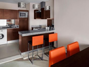 В номере имеется кофе-машина (но всего две капсулы на номер, не пополнялись). Удобная кровать, идеально чистое белье, халаты. Отличный интернет. Есть трансферы на пляж Кайт (утром), JBR (днем) и в аутлет молл.
