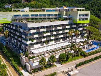 Грязный "приватный" пляж с гвоздями и мусором, платные лежаки, ужасных заход в море с "приватного" пляжа (поэтому большинство идут купаться рядом - на городской), ужасные завтраки - всё на масле и невкусно, отель - явно не 4 звезды, ванная комната - совмещенная с туалетом, только душевая кабина без ванны, платная "приватная" парковка, в номерах убираются плохо