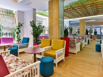 еда очень скудная, однообразная, из сезонных фруктов был только арбуз и то, на ужин, в обед лишь апельсины или грейпфруты. плохо с зелёными салатами, они отсутствовали, ни рукколы, ни шпината не было ни разу. мясо часто было довольно жёстким. нет просто макарон, только в соусах, а дети едят без соуса. по системе все включено напитки только из автоматов, кофе растворимый (за 2 евро можно заказать зерновой, вкусный), а молоко из автомата с сахаром, зачем???