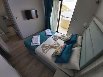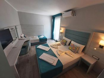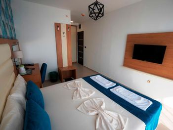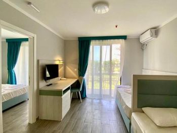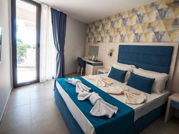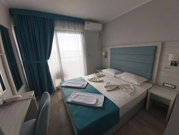 приехали на день раньше без проблем заселили переоформили можно было день доплатить но так как автобанов нету в стране 200 км по мелким дорогам ехать мы не стали продлевать как я уже говорил отель не работал полностью номеров хоть отбавляй даже по просьбе жены поменяли номер с нулевой на третий этаж и с видом на море хотя в заказе было с видом на территорию или бассейн номер был заказан