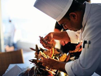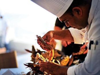 Пляж, но очень много народа на пляже и в ресторане.