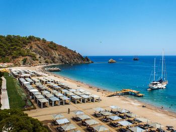 Отдохнуть на пляже так же не представляется возможным, так как люди занимают лежаки в 5:30 утра, то есть после завтрака найти свободный лежак невозможно. Людей очень много, никакой социальной дистанции на пляже нет. Вариантов 2: вип-кабинки по 250 евро за день, или расположиться на полотенце, как на диком пляже.
