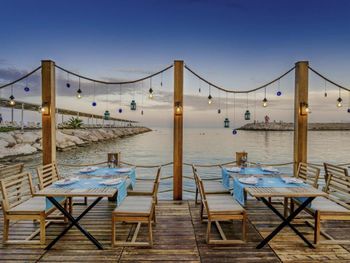 Пляж: разноразмерная галька, для захода в море нужны тапочки. Шезлонги и полотенца довольно свежие. Ресторан на пристани с потрясающим видом.