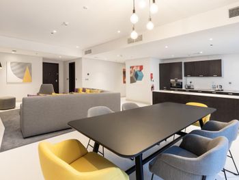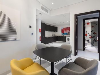 Апартаменты просто огонь, на пятерых человек 90 квадратов более чем. Номер с двумя спальнями и холлом, переходящим в кухню. В кухне - стиральная машина и посудомойка, духовка, она же микроволновка, очень мощный холодильник. Базовый набор посуды для приготовления (2 кастрюли и сковорода) и употребления (столовый набор тарелки, стаканы, кружки, столовые приборы) пищи, тостер, чайник. Три туалета, два из них совмещены с душевыми. Постели отличные, белье меняли, полотенца приносили. С приготовлением еды никаких вопросов - рядом супермаркеты с качественными продуктами и доступными ценами. Станция метро рядом, в центр города доехать никаких проблем. На ресепшене представитель туристической компании - вот его рекомендую однозначно. Билеты в парки развлечений, доставка туда и в аэропорт по очень приемлемым ценам, например стоимость посещения леголенда при официозе в 300 с чем то дирхам на человека он предложил по 220. У него свой транспорт - большой минивен, в котором пять пассажиров с багажом помещалось без проблем. Пляж АльМамзар платный, 5 дирхам с человека, можно в кассе платить налом или даже картой дубайского метро NOL, пляж прям класс - песок, мало народу (учитывать что мы были перед началом сезона), море к сожалению горячее, градусов под тридцать, соленое, солонее Чёрного или Средиземного. Живности мало, но рыбки плавают. Обратить внимание - понедельник и среда женский с детьми день. Мужчин и подростков мужского пола не пустят. До пляжа ездит шаттл (автобус) из отеля в 9, 10, 13 и 18 часов. Мы ездили в 10 туда и в 13.15 обратно. Ждали автобус на остановке под кондиционером. Кондиционеры, к слову, везде. Это спасает. Бассейн неплох. Прохладен. В "пляжные бабьи дни" можно чилить там, загорать, смотреть на взлетающие самолеты и расслабляться. Завтрак отличный. Шведский стол, хорошая и качественная еда. Еда исключительно халяль, что в этой стране ожидаемо и не удивительно. Завтраки оказались весьма неплохи. Положительное впечатление. Думаю еще вернемся туда.