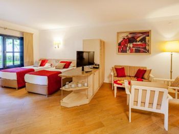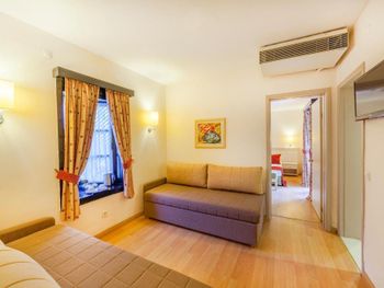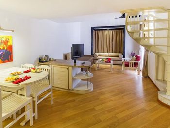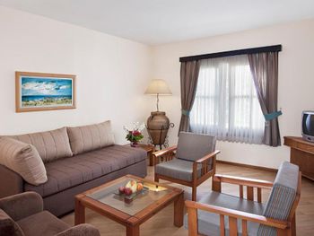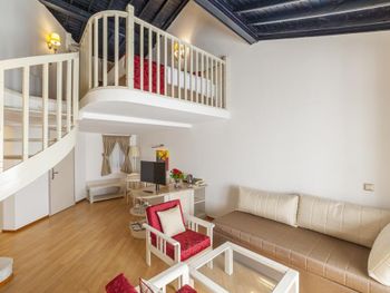 Мы в компании 4-х взрослых и 2-х детей отдыхали в двухэтажных апартаментах в бунгало. Отличный просторный и современный номер. Очень понравилась большая зелёная территория,большие тёплые бассейны и аквапарк,отличное разнообразное питание.Отличный трансфер от аэропорта на комфортабельном микроавтобусе для проживающих от 10 дней.