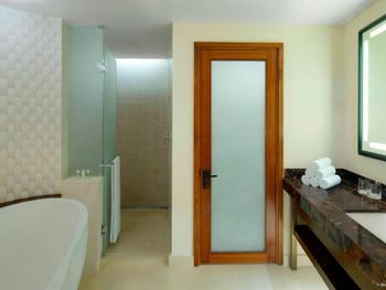Ковер в номере требует основательной чистки, из под двери душа подтекала вода на пол в ванной комнате.