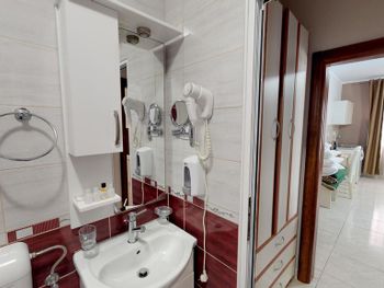 Огромные электрические ворота без альтернативного входа, нужно ждать, пока откроются. В бассейне неприятный запах. Многоэтажное здание без лифта. Не было двухместного номера, пришлось брать 3х. Есть плита, но нет посуды, чтобы готовить. Ручки на дверцах в застывшем жире или грязи, неприятно прикасаться. Нет моющих средств, губки для мытья посуды- ничего. Температура воды не контролируется в кранах, постоянно меняется самопроизвольно то холодная, то горячая. Душевая кабинка очень маленькая, не повернуться.