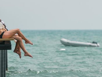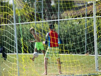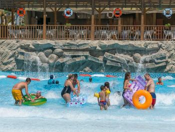 Погода хорошая, все в купальниках, но бывает прохладный ветерок.