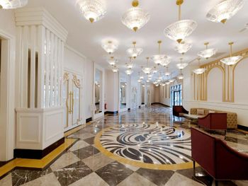 Modernly decorated, all rooms include a flat-screen TV. Each also has a marble bathroom.