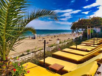 Лежаки при отели были не очень комфортными (они водоотталкивающие, и даже на полотенце на них было жарко лежать.