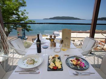 Расположение,собственный пляж.Хороший ресторан.