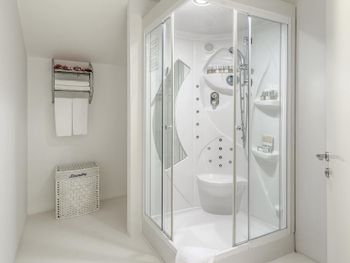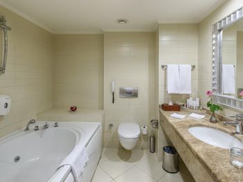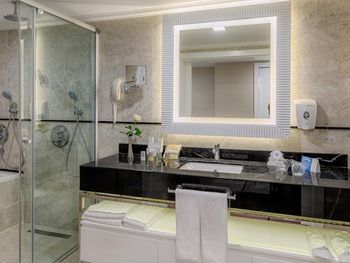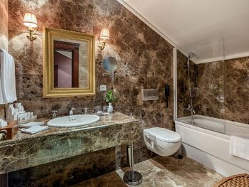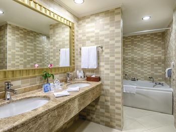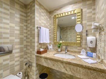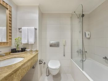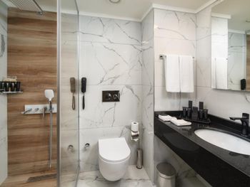 Ванная комната тесная. Жаль, что все рестораны платные, кроме основного.