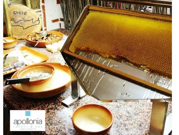 В курортном спа-отеле Apollonia есть греческая таверна и 2 ресторана с обслуживанием по меню, где подают итальянские и веганские блюда. Кроме того, в распоряжении гостей снэк-бар у бассейна, пиццерия, пляжный бар, лобби-бар и диско-зал. По утрам в курортном спа-отеле Apollonia сервируется завтрак «шведский стол» с греческими продуктами, в том числе с традиционным греческим кофе, сыром, оливками и пикантной выпечкой.