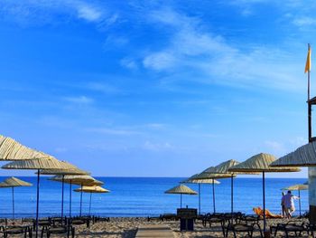 Пляж большой песчаный, лежаки на достаточном расстоянии друг от друга. Проблем с поиском лежаков не было. Полотенца меняют 1 раз в два дня с 10 до 12 утра. Сам регион очень ветренный из 12 дней только 3 дня был слабый ветер, остальные дни было очень ветрено. Из-за ветра некомфортно лежать на пляже, а также из-за ветра постоянные волны. Проблему усугубляет то, что морское дно все каменистое, с камнями разной высоты. Из-за чего прыгать на волнах достаточно опасно, у нас были постоянно поцарапанные ноги. В море купалось не более 15 человек. 3 дня, в которые не было больших волн, была очень холодная вода.