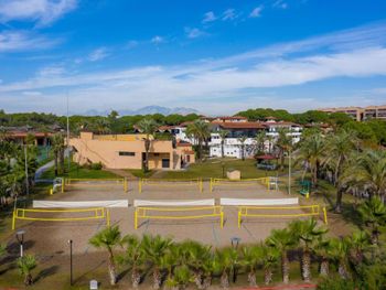 Рядом с аэропортом. Много зелени. Широкий пляж. Огромная территория отеля.