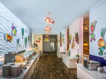 Очень грязно, убирались через день и то только мусор, за 2 недели нам помыли пол всего 1 раз, когда мы уже сами позвонили и потом контролировали уборщицу. Еда однообразная. Ресторан слишком маленький для такого количества гостей, каждый раз приходилось долго искать свободный столик, везде очереди.