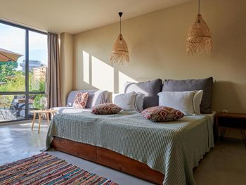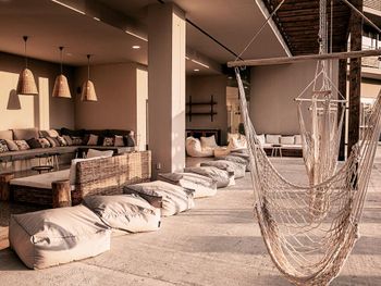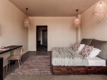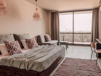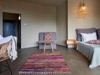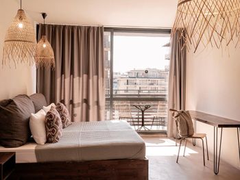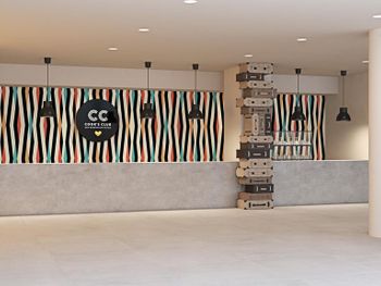 Атмосфера, интерьер были не в моем вкусу. На всех фотках гостиницы изменена цветовая гамма на более пастельные цвета, а на самом деле все серое, черное и мрачное. Освещение максимально тусклое. Перегородок между балконами номеров можно сказать нет. Если вы тусовщик, студент или просто тоскуете по студенческим временам, то вам точно сюда. Все максимально ассоциируется с общежитием. К сожалению, мне с женой такой формат не подошел. Повелись на фотки и не прочитали отзывы.