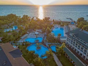 Отел помогает организовать трансфер , я покупала номер с видом land view на 2х взрослых и 2х детей но заехали мы в 7 утра и через 10 минут нам дали sea view с прекрасным видом . У меня в номере все работало , все +- новое , не ламается не течет , кровать удобная , шум был до 11 пока шла программа , и то дня 3 . Потом переехали в амфитеатр . Любой вопрос решали быстро и бесплатно )) нам очень завидовали ребята с которыми мы познакомились , дали беседку от которой мы были в восторге возле моря , официанты бегают приносят все , девчонки все решают. Я сказала менеджеру Маргарите что если бы не она я б наверное не была в таком восторге от отдыха . Позднее выселение с детками - пожалуйста , отель точно стоил своих денег , с радостью отдохнула бы с этой командой еще раз. Риксосу есть чему поучиться как вести диалог с гостями . Анимация хорошая, шоу , мне кажется Казахов было очень много в персонале , что радует, по моему турки давно устали и не скрывают что мы им надоели , даже в этом отеле ))) еда разнообразная. Что поесть в 2 х больших залах и на террасе найдете . Супы очень вкусные . Пантон море, удобные лежаки , не жмут эти полотенца , понравилось супер спасибо