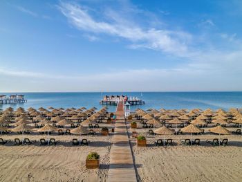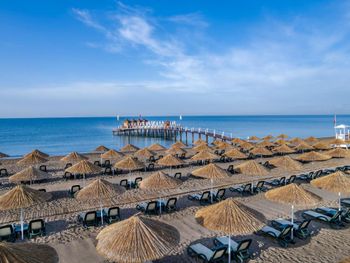 Пляж песочный, в море тоже песочек. Есть небольшая прослойка гальки. На пляже есть небольшой пирс с лежаками, своим душем и спуском в воду. Даже там ловил интернет с отеля. Лежаков много, нам всегда удавалось найти место и у бассейна, и у моря. На пляже есть бар, в котором готовят вкусные безалкогольные коктейли. Отдыхающим у бассейна регулярно подвозят холодные напитки. Каждый день в бассейне проводят фитнес-тренировки, но, к сожалению, нет никакой тени, а проходят они в самое жаркое время - в районе 11-12 часов.